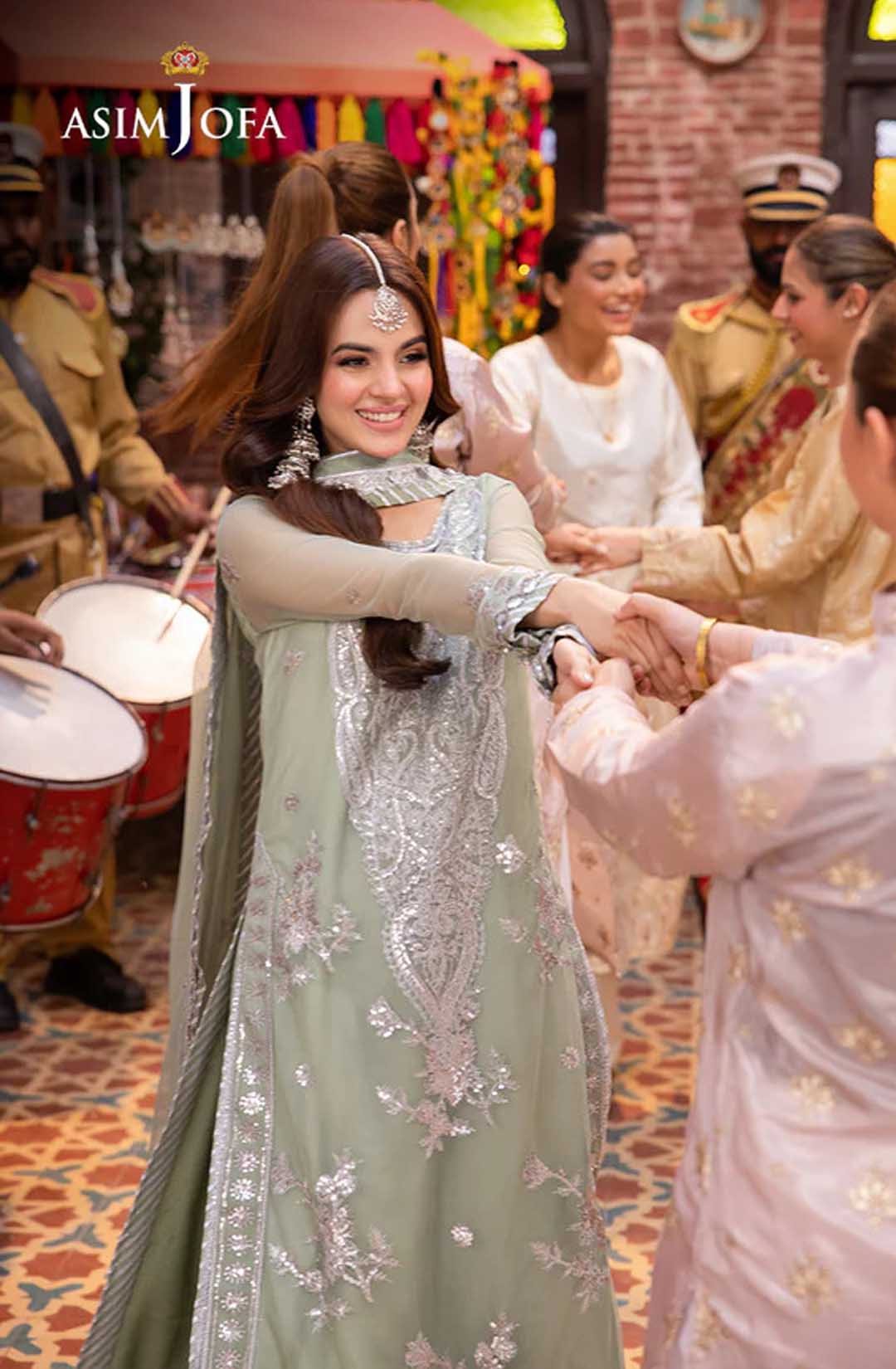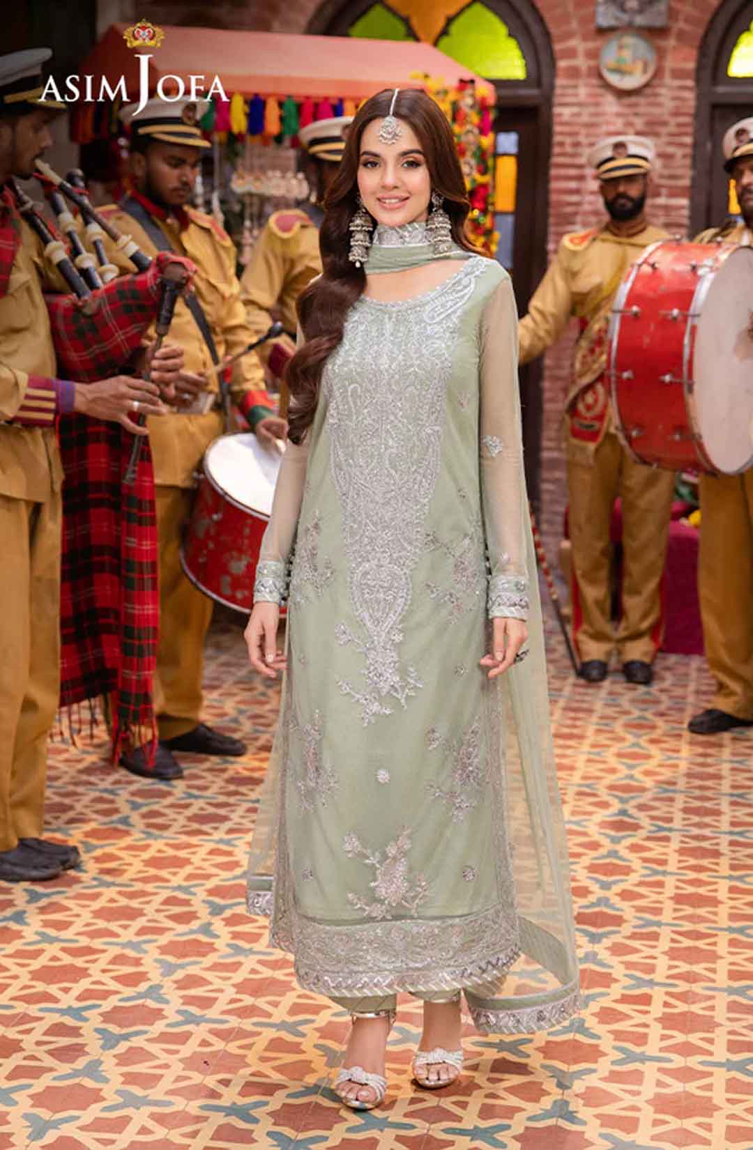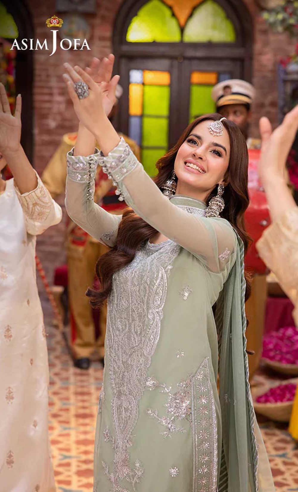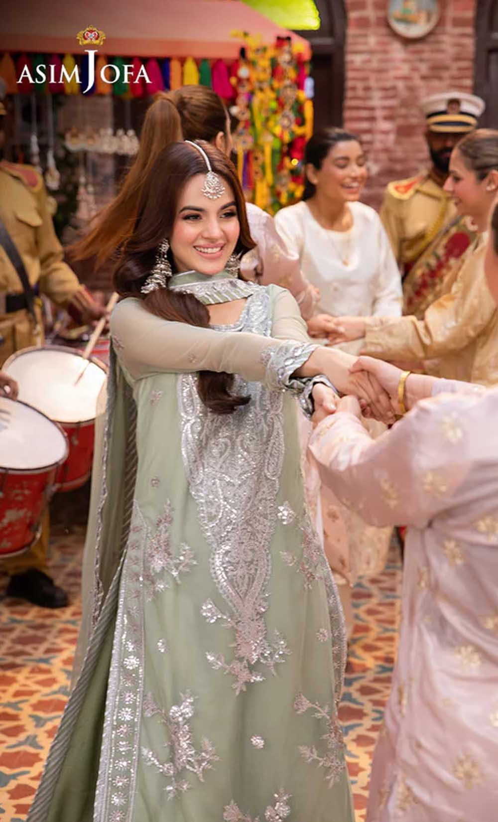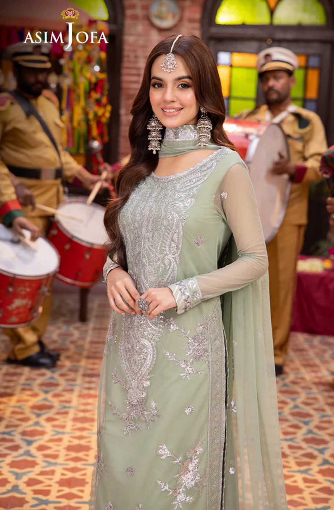 Indulge in the pure joy of celebration with this Asim Jofa ensemble, a symphony of happiness woven into every thread. The Shirt in a refreshing laurel green color evokes the cool embrace of a delightful summer breeze with intricate embroidery gracing the neckline and border, while the shimmering silver zariwork and sequins embellishment dance across the fabric like moonlight on a festive night. Paired with a flowing dupatta, featuring gorgeous embroidery, a joyous spirit radiates that rivals the sparkle of the embellishments. The outfit itself flows with an effortless grace, much like laughter echoing through a lively gathering.