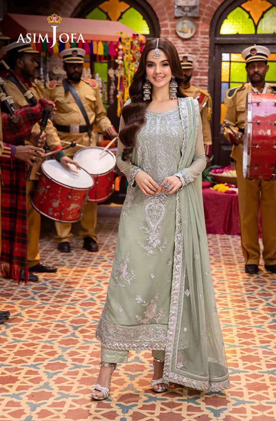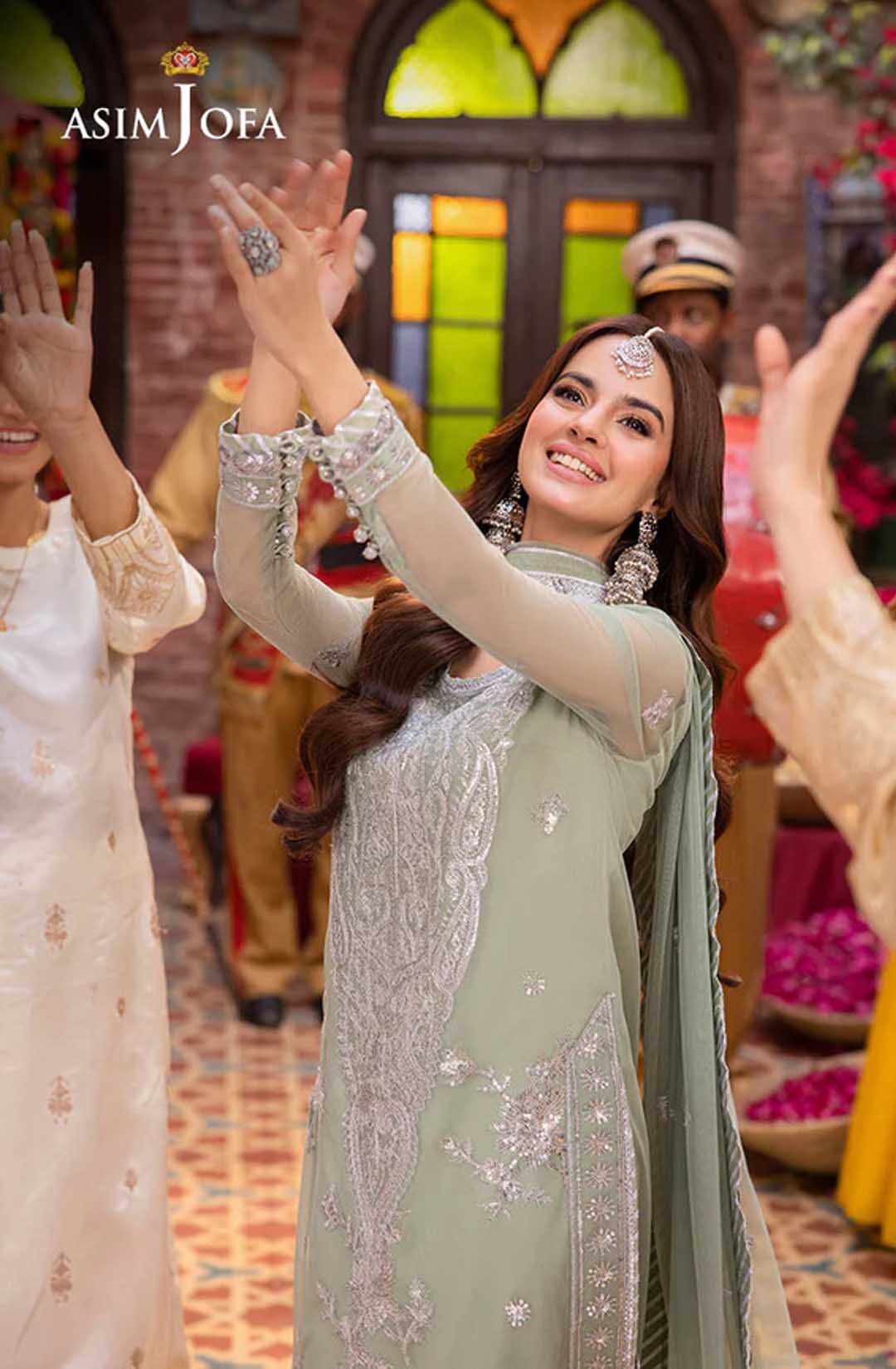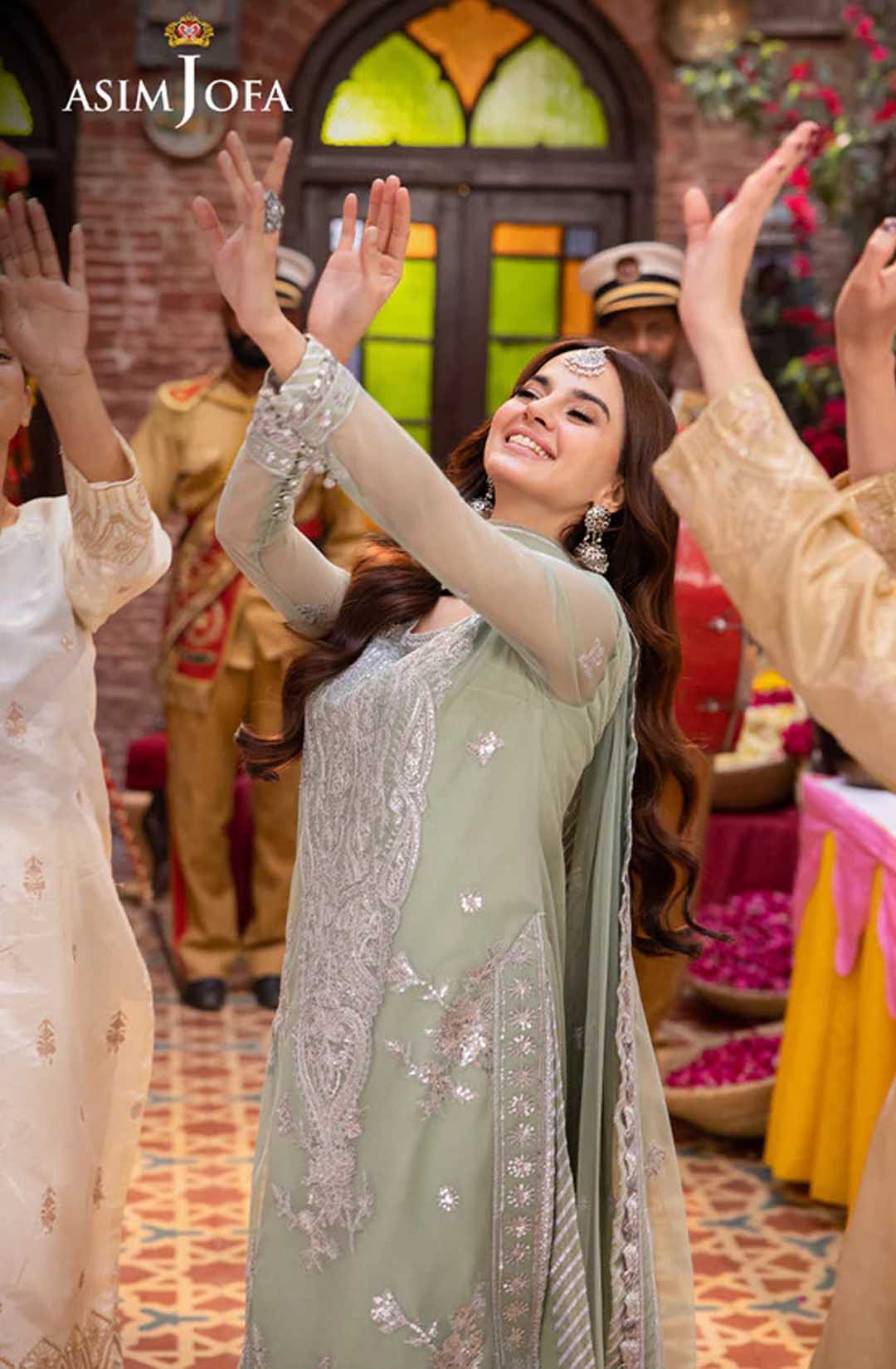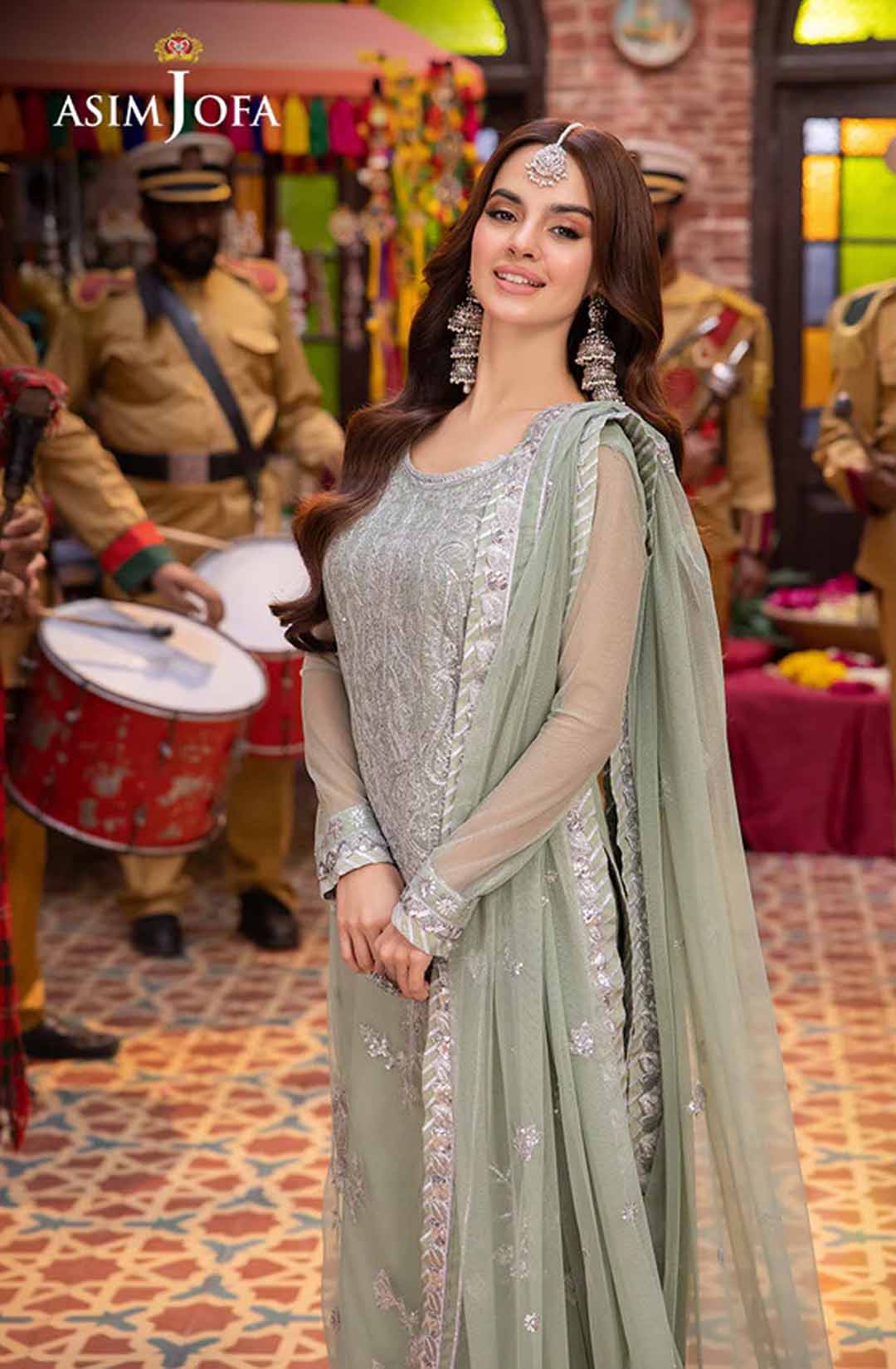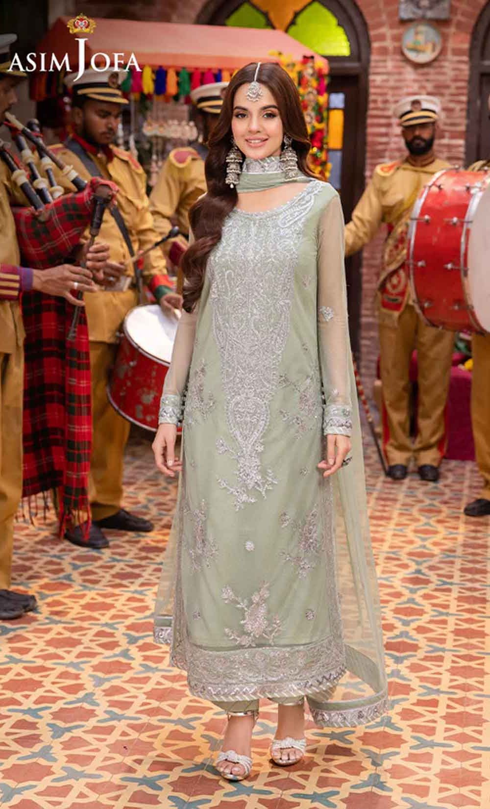 Indulge in the pure joy of celebration with this Asim Jofa ensemble, a symphony of happiness woven into every thread. The Shirt in a refreshing laurel green color evokes the cool embrace of a delightful summer breeze with intricate embroidery gracing the neckline and border, while the shimmering silver zariwork and sequins embellishment dance across the fabric like moonlight on a festive night. Paired with a flowing dupatta, featuring gorgeous embroidery, a joyous spirit radiates that rivals the sparkle of the embellishments. The outfit itself flows with an effortless grace, much like laughter echoing through a lively gathering.