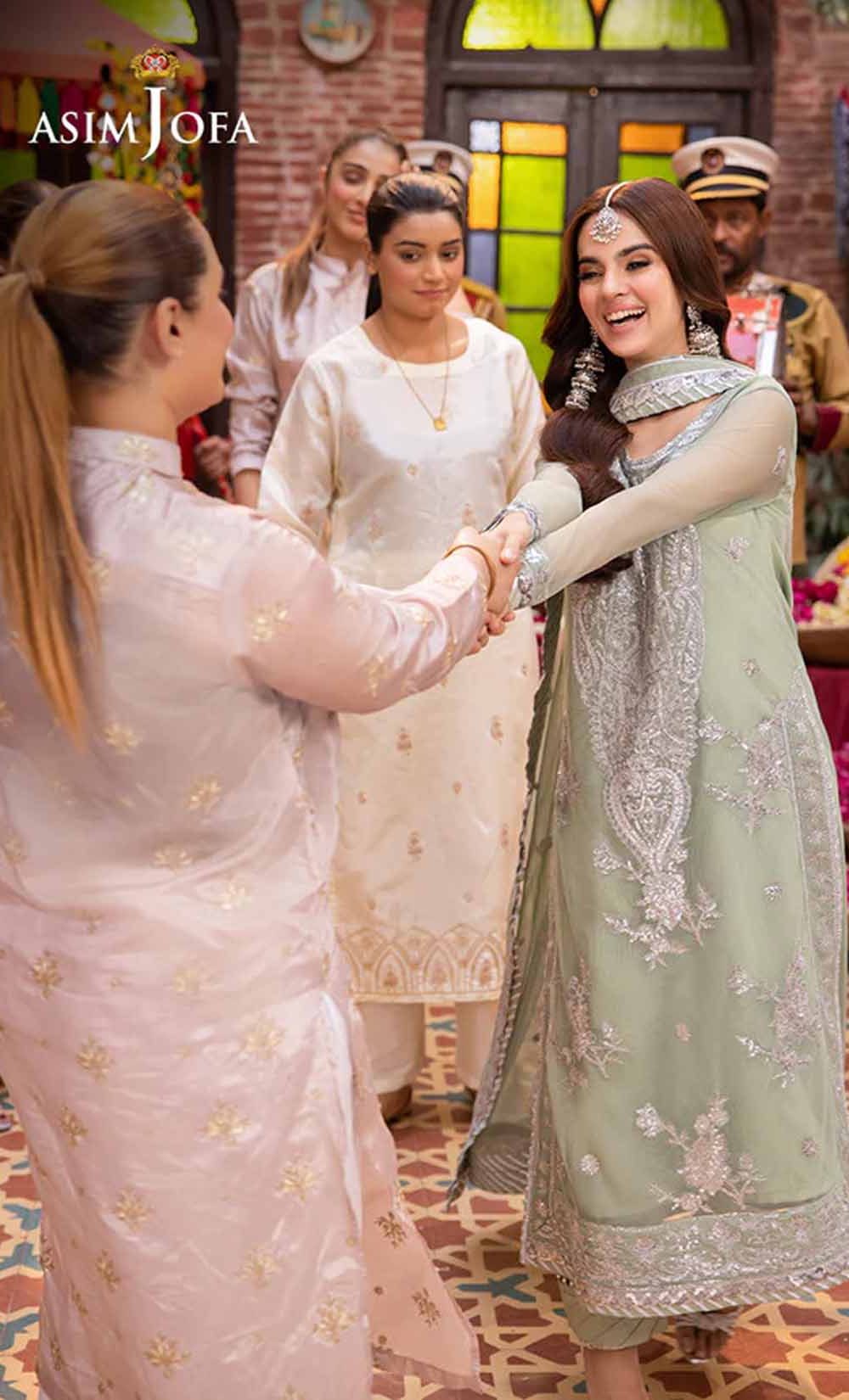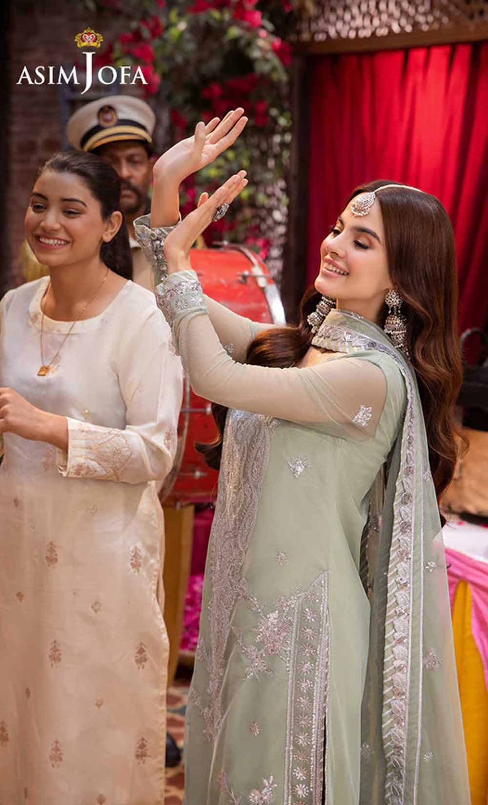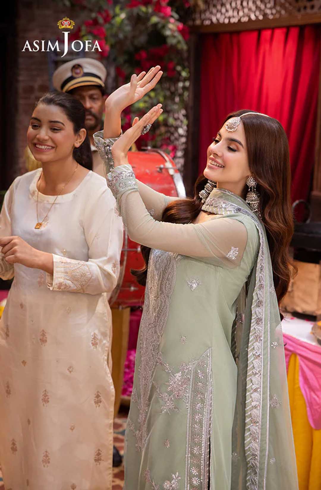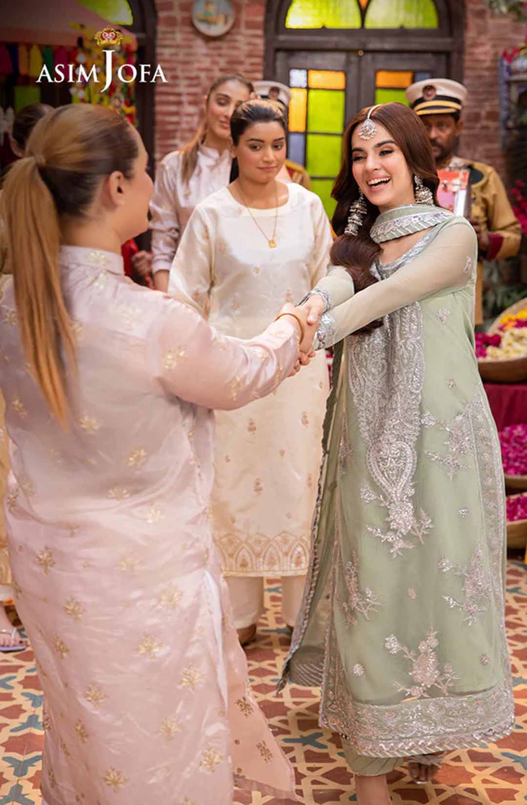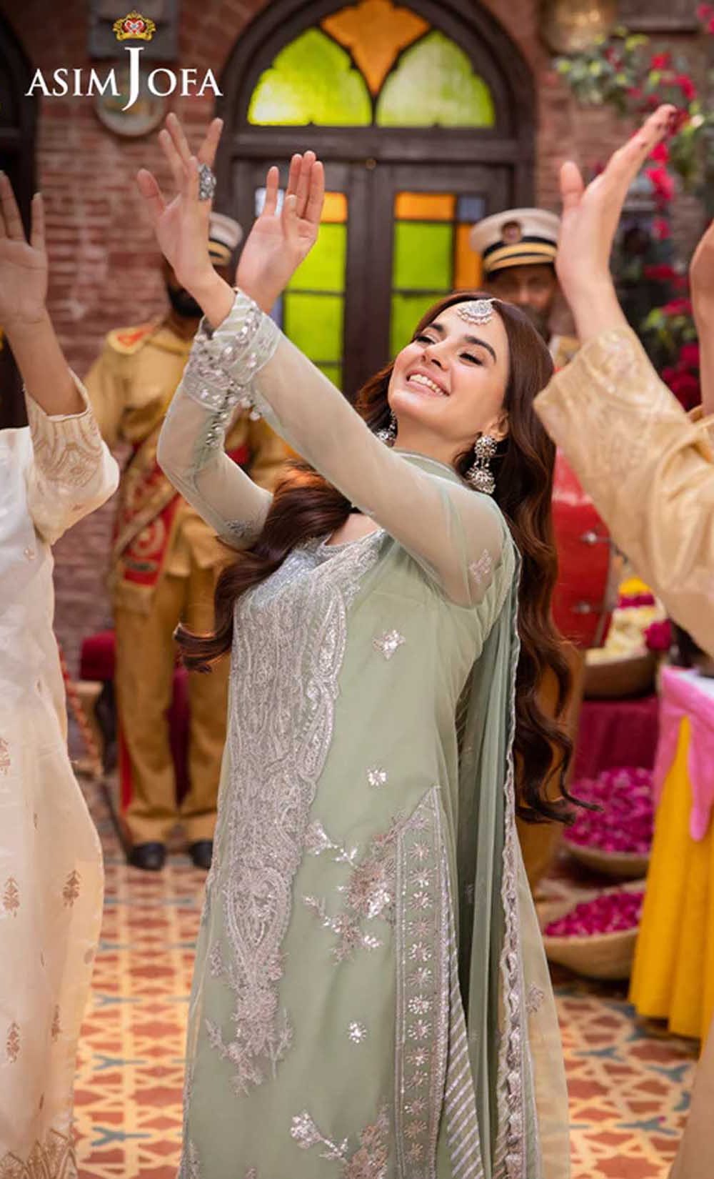 Indulge in the pure joy of celebration with this Asim Jofa ensemble, a symphony of happiness woven into every thread. The Shirt in a refreshing laurel green color evokes the cool embrace of a delightful summer breeze with intricate embroidery gracing the neckline and border, while the shimmering silver zariwork and sequins embellishment dance across the fabric like moonlight on a festive night. Paired with a flowing dupatta, featuring gorgeous embroidery, a joyous spirit radiates that rivals the sparkle of the embellishments. The outfit itself flows with an effortless grace, much like laughter echoing through a lively gathering.