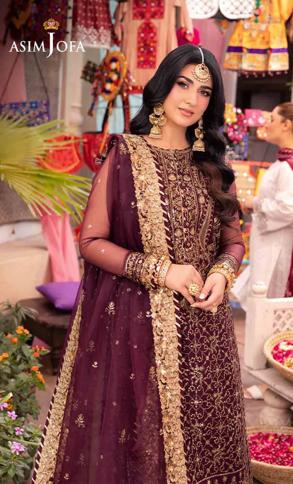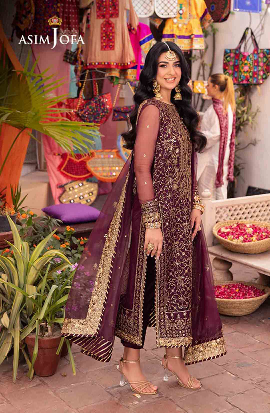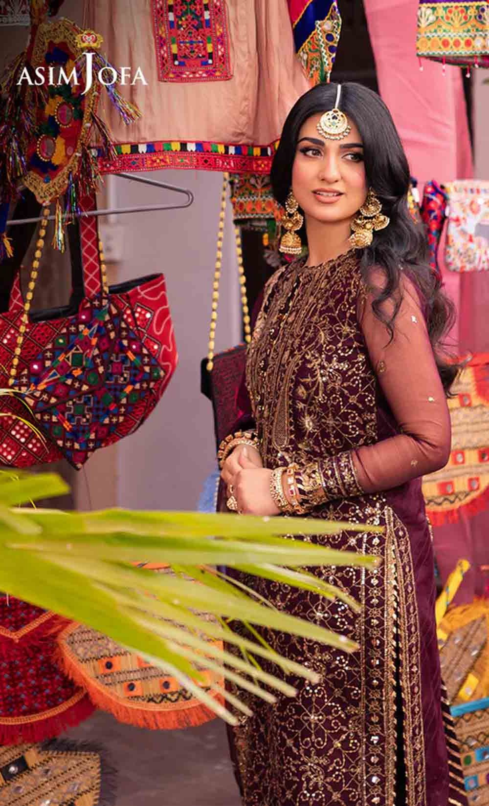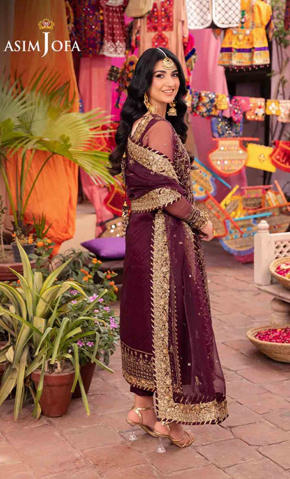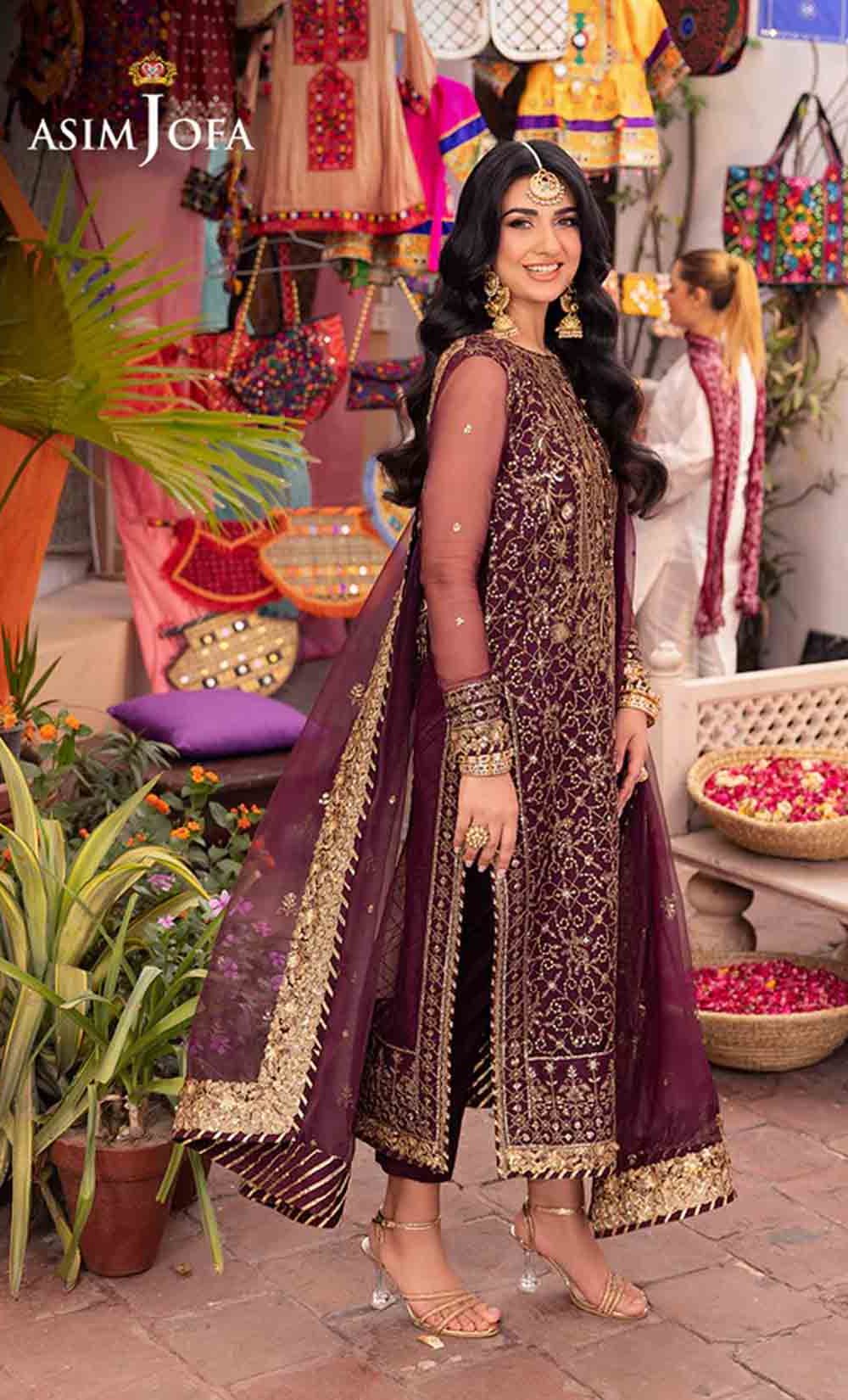 Slip into the enchanting embrace of twilight with this captivating ensemble. The shirt shines like a nebula, adorned with a constellation of gold embroidery, each stitch a whispered promise of beauty. Resplendent light gold sequins accompanied by two-toned zariwork, catch the light like scattered amethysts, capturing the ephemeral magic of a twilight sky. The neckline and border, like a crown of stardust, boast intricate embroidery with celestial motifs that evoke a sense of wonder. Completing this mesmerizing symphony is a diaphanous, embroidered dupatta, its flowing form echoing the celestial dance of the shirt. This breathtaking creation is a melodic poem woven into fabric; a timeless piece ready to adorn the modern dreamer.