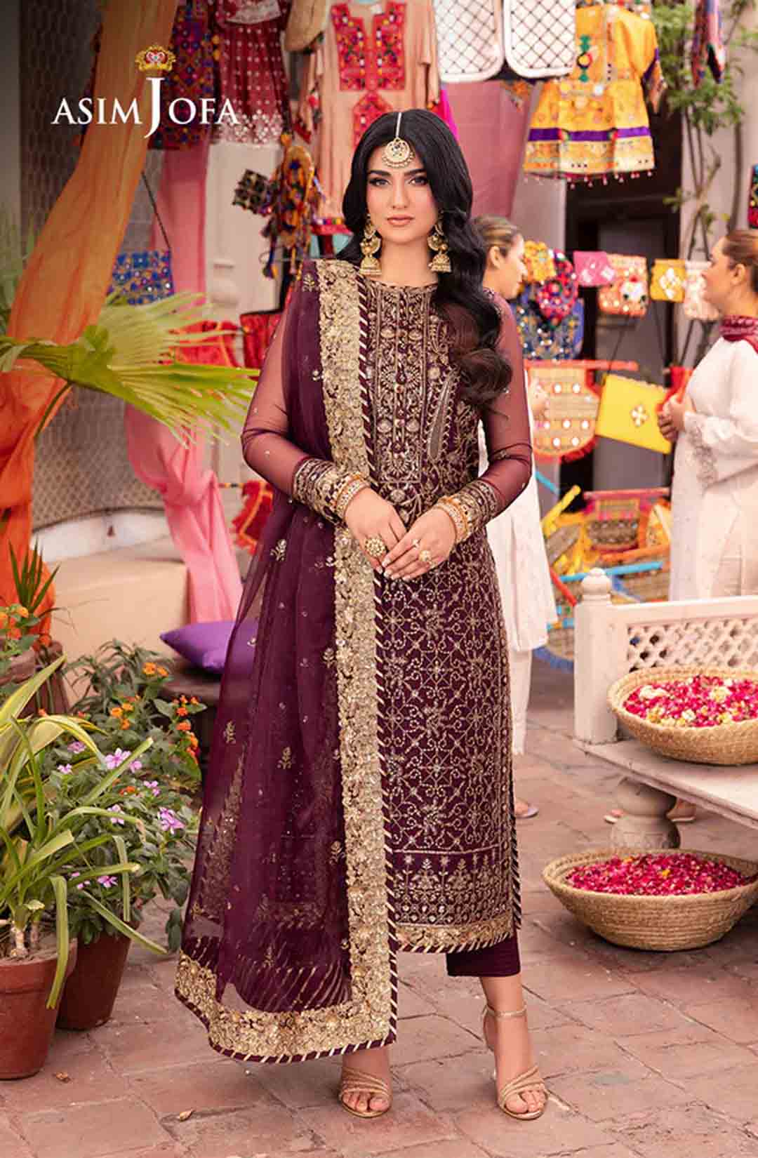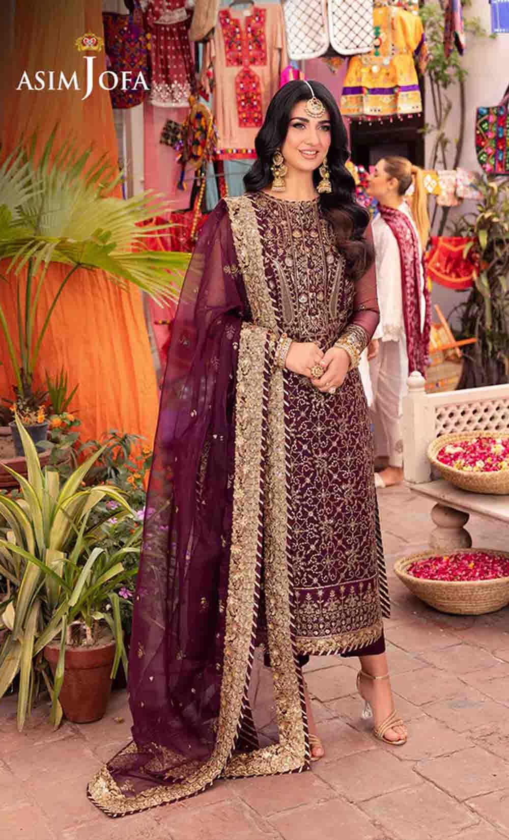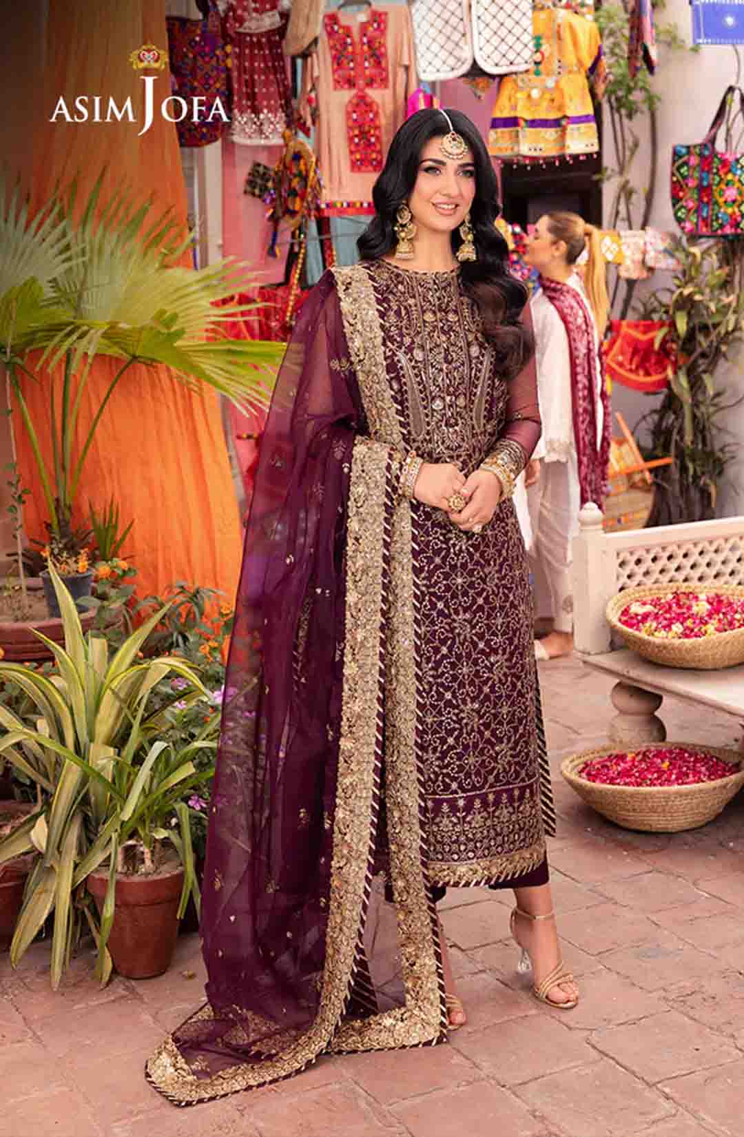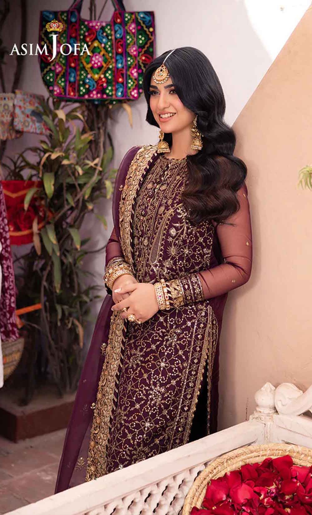 Slip into the enchanting embrace of twilight with this captivating ensemble. The shirt shines like a nebula, adorned with a constellation of gold embroidery, each stitch a whispered promise of beauty. Resplendent light gold sequins accompanied by two-toned zariwork, catch the light like scattered amethysts, capturing the ephemeral magic of a twilight sky. The neckline and border, like a crown of stardust, boast intricate embroidery with celestial motifs that evoke a sense of wonder. Completing this mesmerizing symphony is a diaphanous, embroidered dupatta, its flowing form echoing the celestial dance of the shirt. This breathtaking creation is a melodic poem woven into fabric; a timeless piece ready to adorn the modern dreamer.
