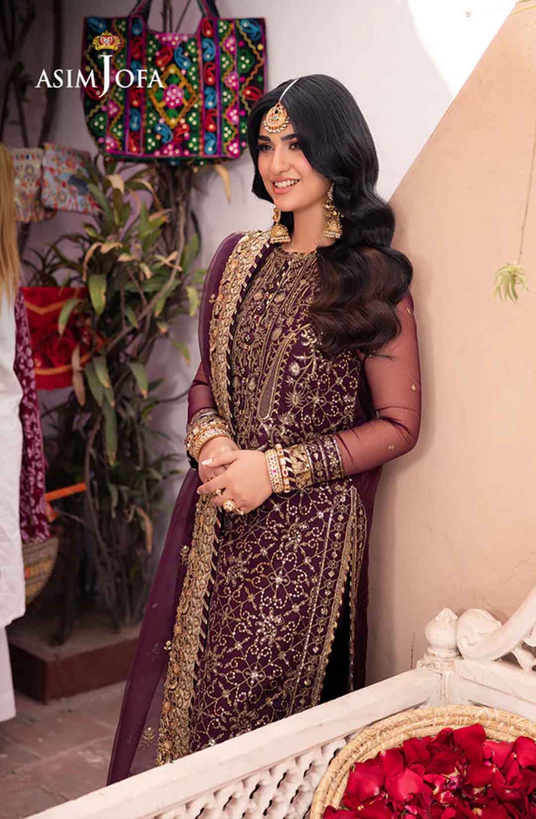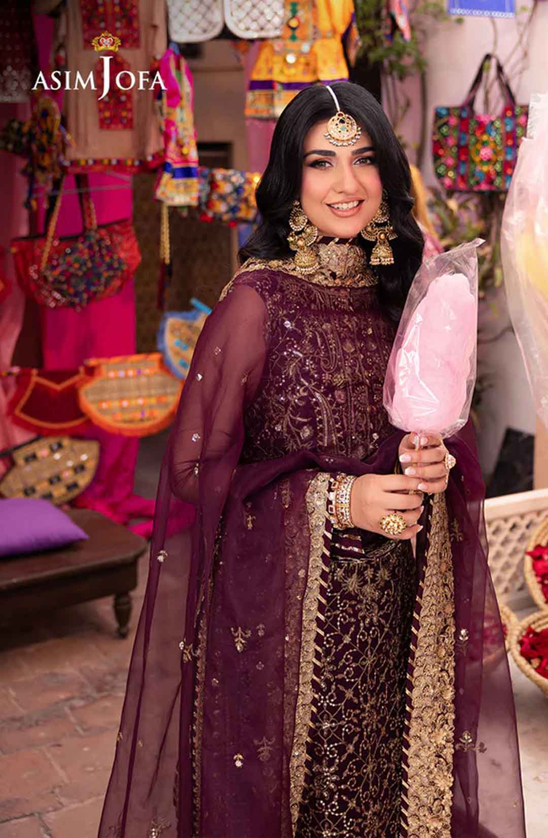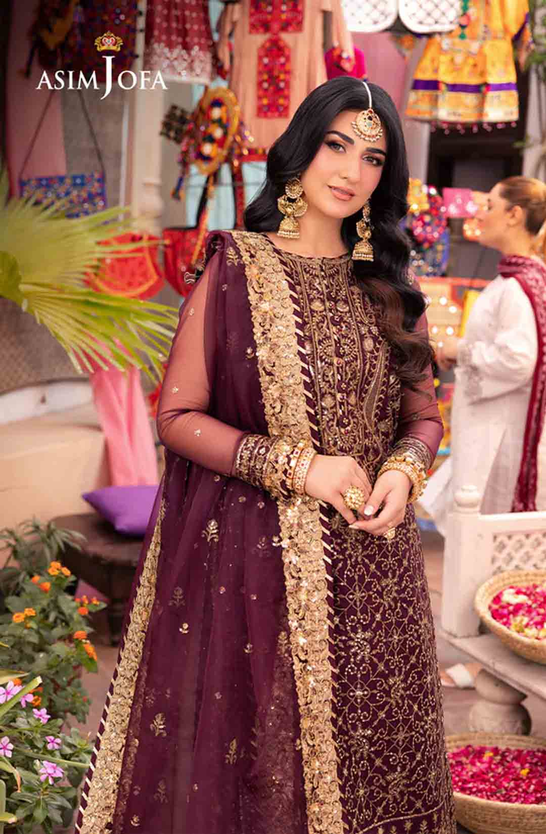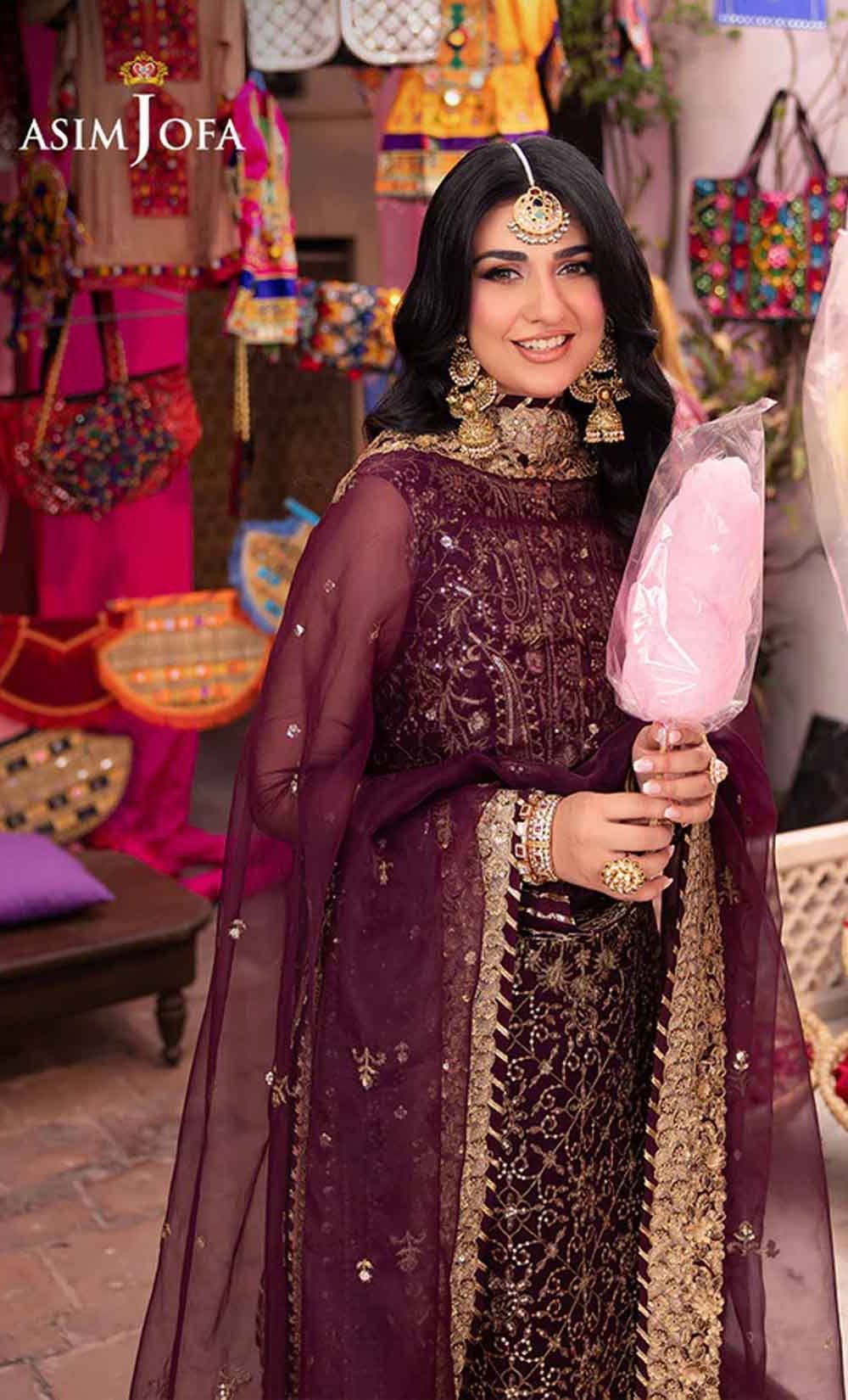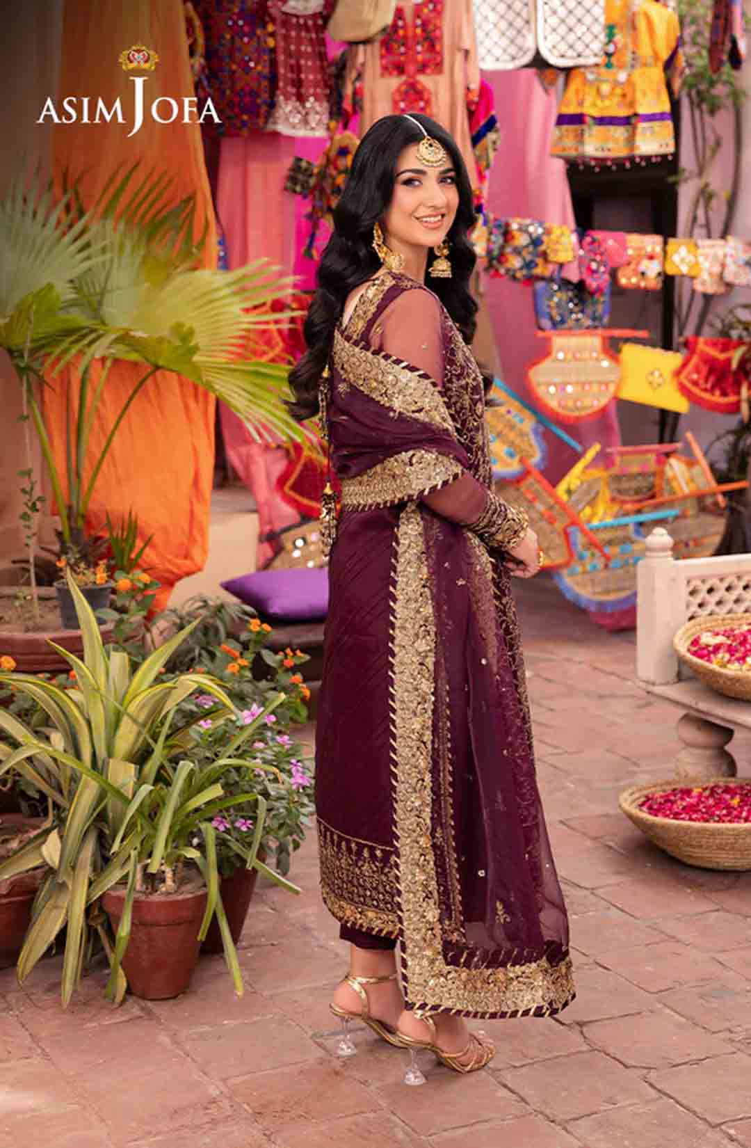 Slip into the enchanting embrace of twilight with this captivating ensemble. The shirt shines like a nebula, adorned with a constellation of gold embroidery, each stitch a whispered promise of beauty. Resplendent light gold sequins accompanied by two-toned zariwork, catch the light like scattered amethysts, capturing the ephemeral magic of a twilight sky. The neckline and border, like a crown of stardust, boast intricate embroidery with celestial motifs that evoke a sense of wonder. Completing this mesmerizing symphony is a diaphanous, embroidered dupatta, its flowing form echoing the celestial dance of the shirt. This breathtaking creation is a melodic poem woven into fabric; a timeless piece ready to adorn the modern dreamer.